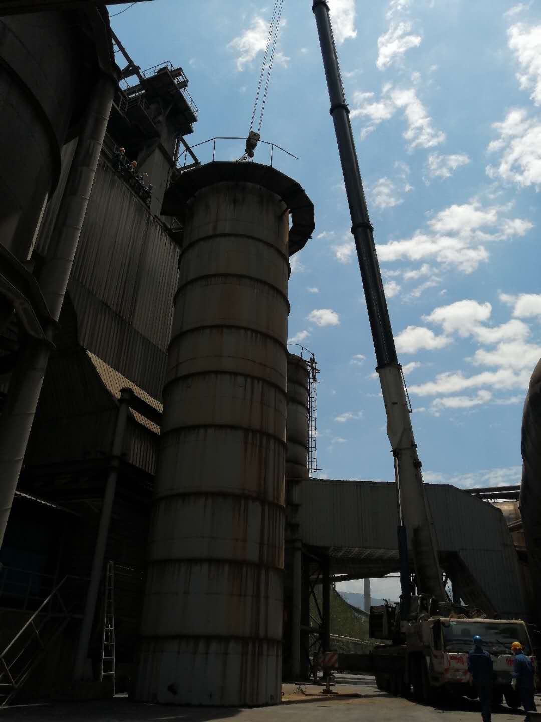 62日天氣晴朗,風力1級,具備良好的施工條件,7:30130噸的吊車準時到達拆除現場,檢修班長針對性的給班員講解具體的拆除工序,具體的安全措施、落實到個人、落實到互保對子。8:30分煙囪頂部的大蓋安全拆除,13:1530噸重的第一節(jié)煙囪安全拆除,16:0015噸重的第二節(jié)煙囪安全拆除。