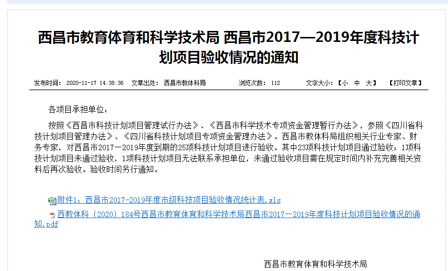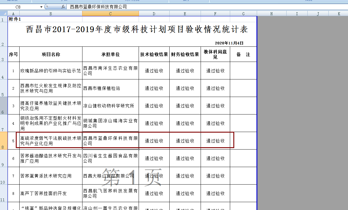 11月17日西昌市教育體育和科學(xué)技術(shù)局在西昌教育信息業(yè)務(wù)系統(tǒng)網(wǎng)公布西昌市2017-2019年度科技計(jì)劃項(xiàng)目驗(yàn)收情況,本次有23項(xiàng)科技計(jì)劃項(xiàng)目通過驗(yàn)收,其中由西昌市藍(lán)鼎環(huán)?萍加邢薰境袚(dān)的市級科技計(jì)劃項(xiàng)目《高硫濃度煙氣干法脫硫技術(shù)研究與產(chǎn)業(yè)化應(yīng)用》在列。