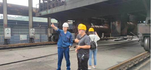 第二組在生產(chǎn)部副部長王建勇的帶領(lǐng)下來到了煉焦的生產(chǎn)現(xiàn)場推焦機(jī)旁,針對(duì)現(xiàn)場重主要設(shè)備的名稱及作用進(jìn)行行詳細(xì)了解。