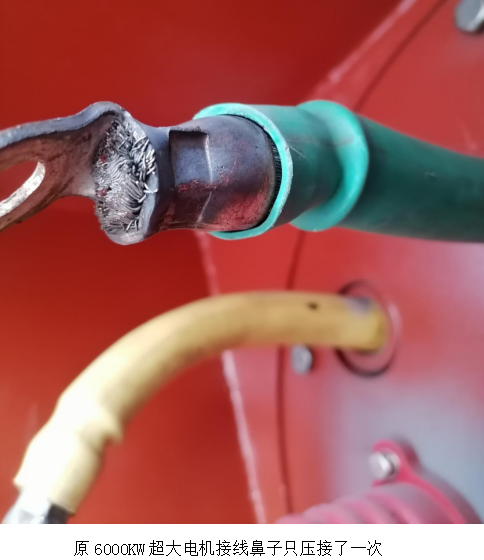 10月10日9:00西昌藍鼎一號燒結機槽滿停機,對應的一期脫硫脫硝系統(tǒng)也停機檢修,本次停機時間為16小時。電儀人員按照檢修計劃正常檢修,按照操作規(guī)程對一期增壓風機電機停電、驗電、接地開蓋檢查。在檢查過程中發(fā)現(xiàn)電機B相接線鼻子有變色現(xiàn)象,通過仔細觀察發(fā)現(xiàn)電機引出線鼻子電機修理廠家只壓接了一次;導致電纜線和線鼻子接觸不良,長期運行將造成接線端子發(fā)熱燒壞,極端情況下會燒壞6000KW的超大電機,造成巨大的經(jīng)濟損失。